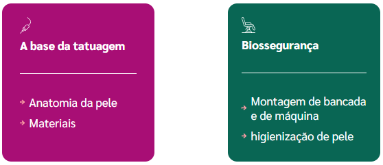 O conteúdo inclui uma introdução ao mundo da tatuagem, biossegurança, processo criativo, técnicas de tatuagem, uso de equipamentos, montagem de bancada, posicionamento nas redes, foto e vídeo, orçamento e precificação, atendimento, apostilas de exercícios, entre outros.